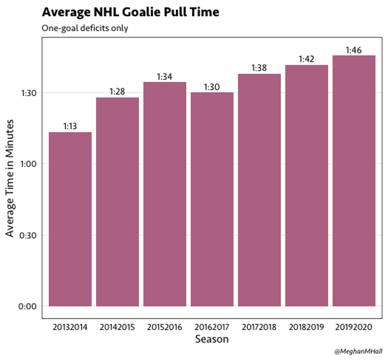 This brings us to the modern day, where over the last decade teams have begun pulling their goalie earlier and earlier. Yet even with that shift, 98% of pulls still occur with under two minutes remaining. As shown in Chart 1, the average pull time has inched earlier between 2013 and 2020 - but not nearly as much as the analytics suggest it should.
