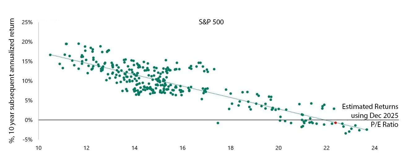 Just as coaches resist pulling the goalie early, even when the math argues for it, investors often resist stepping back from an expensive market, even when the data is unambiguous. At today’s valuations, the numbers paint a sobering picture. With the S&P 500 trading around 23× forward earnings, the historical relationship between starting valuations and future returns suggests that expected 10-year forward returns are, in theory, close to zero (see Chart 2). That doesn’t mean the market must fall, only that the runway for compounding narrows dramatically when you start from this altitude.